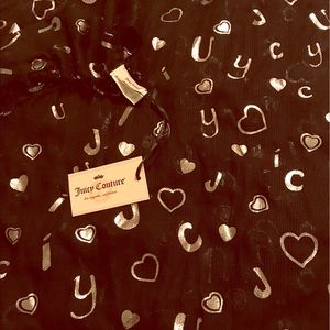 JUICY COUTURE black wrap scarf, 100% acrylic. J-U-I-C-Y lettering + silver heart pattern printed on scarf. NEW WITH TAGS