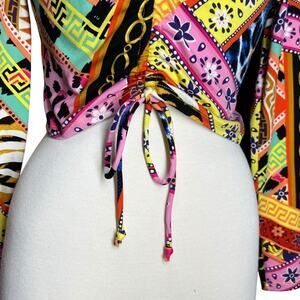 Turn heads in this bold Y2K cropped top by Julia by Love J. Featuring a vibrant patchwork design with mixed animal print, baroque chains, and tribal motifs, this long sleeve top has a ruched front cinch detail for adjustable styling. Made from a soft, stretchy fabric with a body-hugging fit. A standout piece perfect for festivals, concerts, or streetwear looks. Pre-owned and in excellent condition with no stains or holes.