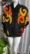 That's a striking vintage-style jacket! It features a bold, eclectic design with bright, swirling appliqué patterns in orange, yellow, and red on a black base, accented by gold-tone studs. The sleeves incorporate multicolor printed fabric, likely inspired by baroque or tapestry motifs, giving it a statement, patchwork-like aesthetic. The jacket also has a high collar, elastic waistband, and cuffs-suggesting it's in a bomber or windbreaker style.