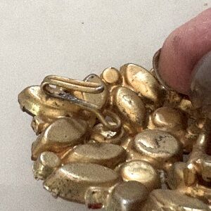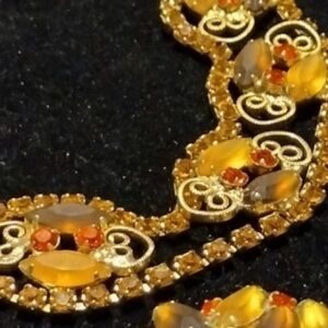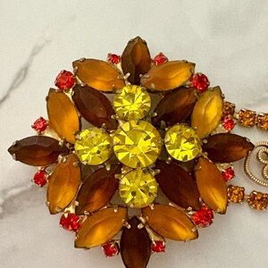 - A dazzling array of rhinestones in warm fall tones in frosted gold and root beer topaz navettes; sparkling small translucent red chaton accents, and large translucent yellow chatons.