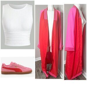 Elevate your wardrobe in this JULIE & JOY Pink and Red DUSTER in size 1X. It is a stylish and comfortable red and pink solid duster and perfect for casual or festive occasions. Made from polyester, this pullover duster features wide long sleeves and is machine washable for easy care. The vibrant red and pink colors add a bohemian touch to the piece, making it a versatile option for the summer, fall, and spring seasons. Designed by the brand JOLIE & JOY, this plus-size duster is a chic addition to any woman's wardrobe.