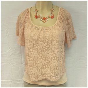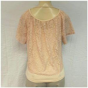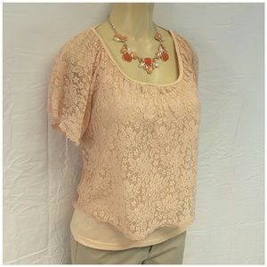 JULIE'S CLOSET Lace Top, size Large See Measurements, tag on collar says M, tag inside says Large See Measurements, sleeves unlined, body fully lined, soft stretchy material, machine washable, polyester cotton spandex blend, approximate measurements: 24" length, 18" to 20" bust laying flat, 10" sleeves. SAVE BIG! AUTOMATIC 30% BUNDLE DISCOUNT! ADD TO A BUNDLE!