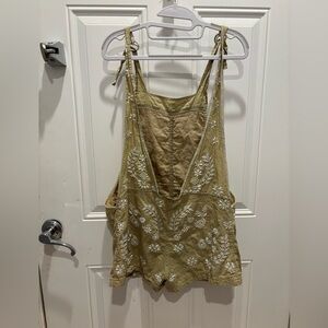 Juliet Dunn short overalls. embroidery detail. Low cut sides and back. Patch pockets. D-ring adjustable straps. Pull-on style. Lightweight 100% cotton. Very good condition. Size is one size.