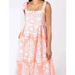 "An airy cotton sundress designed for summer fun. Our palladio print, inspired by Bar Palladio in the beautiful city of Jaipur is created entirely by hand. The tie shoulder straps on this sun dress allow for easy adjustment and a perfect fit. This midi dress is a summer must-have." Color is a mix of orange & pink, coral Front pockets Full button front Fully lined, has no stretch