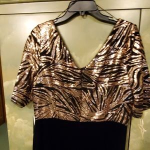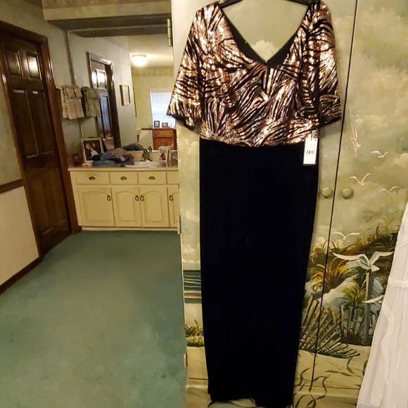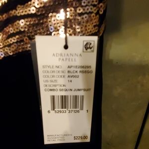 ADRIANNA PAPELL COMBO SEQUIN JUMPSUIT BNWT NEVER WORN. SIZE 14 COLOR GOLD SEQUINS & BLACK VELOUR PANTS & BLACK BETWEEN SEQUINS. ZIP CLOSURE IN BACK.