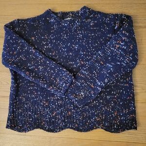 Adorable pullover sweater. Knit from a very soft, navy blue with orange and light blue flecks yarn that reminds me of confetti. it has a ribbed knit scalloped bottom and crew neckline.