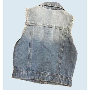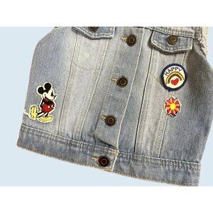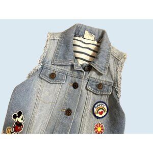 Adorable Junk Food cut off denim vest with patches. Size XS (4). Mickey Mouse, rainbow, and flower patches attached. Full button. Frayed sleeve openings. Really great pre-owned condition!!!