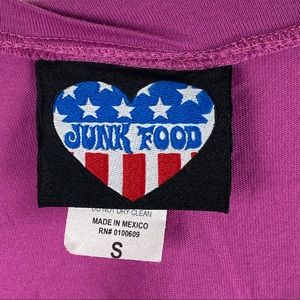 JUNK FOOD Purple “Get Rockin” Graphic Scoop Neck Short Sleeves Tee. Gently worn pre-owned condition with no visible flaws noted.