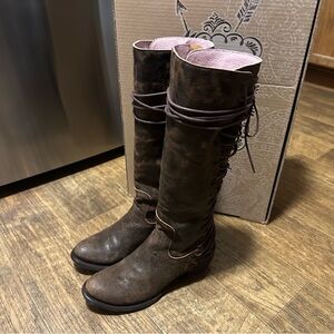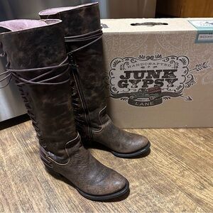 "Junk Gypsy by Lane" collection is known for their handcrafted, vintage-inspired Western boots with high-quality, full-grain leather. Features cushioned insoles for comfort and round toes for a classic silhouette. The corset-style lacing up the back give them the old western appeal to match the soft distressed leather. These are a discontinued model and are highly sought. Zippers for convenience have a removable charm so u can clip any charm to personalize ur boots! (Lane is a large manufacturer of western boots.)