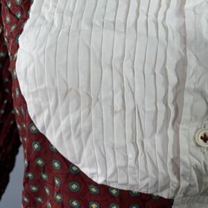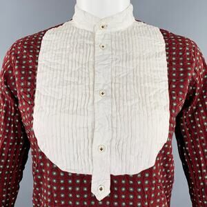 JUNYA WATANABE dress in a burgundy and white polyester fabric featuring a wrinkled style, dots pattern, pleated front, and half placket button closure. Made in Japan.
