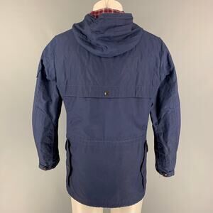 JUNYA WATANABE jacket comes in a navy coated canvas with a plaid trim featuring a nautical style, brown corduroy trim, patch pockets, drawstring, hooded, top stitching, and a zip & buttoned closure. Made in Japan.