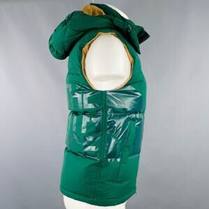 JUNYA WATANABE x THE NORTH FACE vest in a green cotton nylon woven blend fabric featuring a quilted and down-filled style, snap hood, THE NORTH FACE logo print on back, and zip up closure.