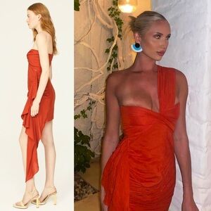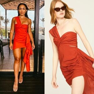 JUST BEE QUEEN Linen Asymmetric Draped 1 Shoulder Cutout Ruched Solange Dress L