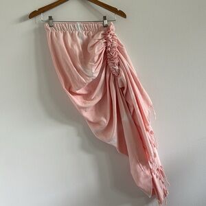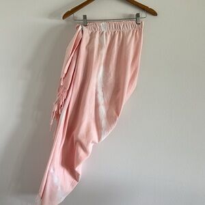 Tie-dyed print, gathered skirt, asymmetric tassel fringed hem