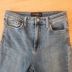 These Just Black denim jeans feature a skinny silhouette, high rise, distressed knees, a medium blue wash and lots of stretch. They are soft and comfortable. Unlike most Just Black skinny's these do NOT have a frayed bottom, they have the traditional denim hem. EUC.