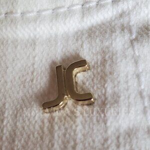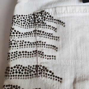 Unique Features: Skinny fit white cotton blend jeans with beautiful crystal detail on the side. Zip / Button closure. Pockets.