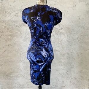 JUST CAVALLI dress featuring a butterfly/snake print with gold beaded detail at shoulder, v-neckline, midi-length, partially lined, Bodycon fit, and pullover style. Made in Italy. Size 38 IT, XS. Never worn and in excellent condition. *See photos for approximate measurements laying flat.