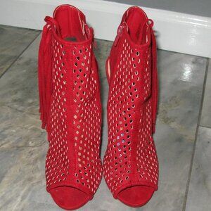 JUST Fab Red Faux Suede Fringe High Heel Open Toe Ankle Boots Size 7.5
