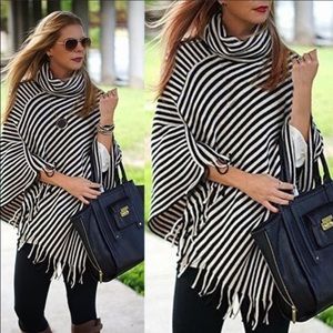❣️Gorgeous Cowl Neck Fringed Poncho❣️ Nice, elongating vertical stripes. Please like or comment to reserve yours today! I will have 3 if these for now.