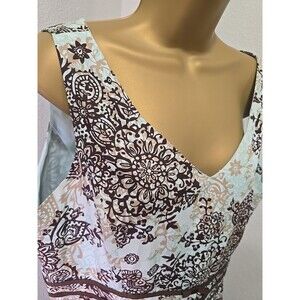 This is a Just in Thyme fit and flare dress for women in size 16 petite. The dress features a sleeveless design with a V-neckline and a zip closure. It is made of 100% cotton in a multicolor paisley pattern. The knee-length dress has pleated accents, a bow detail, and is lined. Suitable for various occasions such as travel, weddings, parties, and workwear, it is ideal for summer, fall, and spring seasons.