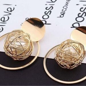 These gold earrings showcase a modern geometric design with a pearl and a distinctive double-circle pattern. The intricate wire sphere within the larger circle adds a touch of architectural elegance, making them a standout accessory.