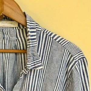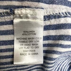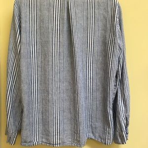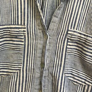 Casual Linen and Cotton button down with blue and white vertical stripes. Comfortable fabric with pockets in the front that drapes nicely. Buttons to cuff/ roll sleeves nicely.