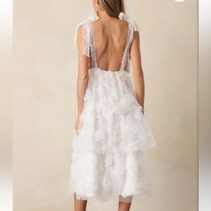 Features: White, Sleeveless, Deep V-neck, Tiered skirt, Lace detailing, Adjustable tie straps, low open back, Concealed elastic waist band