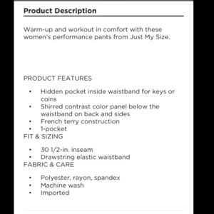 Just My Size french terry performance pant 1X (16W) approximate inseam 30 1/2 waist 15 1/2 NWT see photos for more details