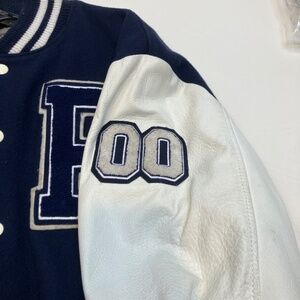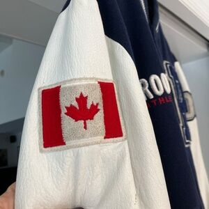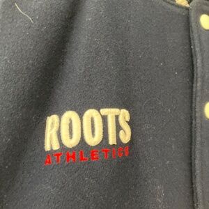 Amazing vintage ROOTS jacket. In FANTASTIC shape. Wool body, leather sleeves. Selling online for $695 as you can see by the picture. This is an amazing jacket. Looks great on anyone. The only sign of wear is our name crossed off Inside the collar as you can see by the picture. Priced to sell quickly.