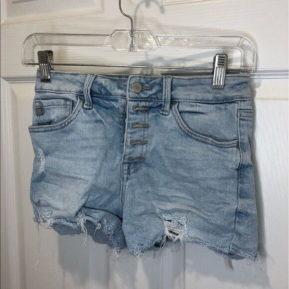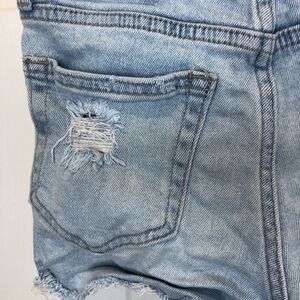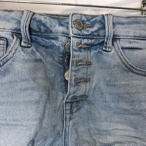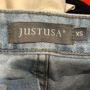 JUST USA frayed edge denim jean shorts. Distressed throughout, 4 pockets, 4 button front closure. Length 10in, inseam 3in, waist 12in.🌸