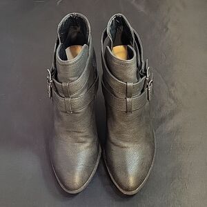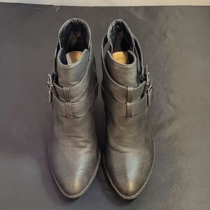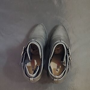 JUSTFAB LEATHER POINTED TOE TWO ADJUSTABLE BUCKLE CUTOUT DESIGN BOOTIES SIZE 7 COLOR BLACK GRAY MADE WITH FABRIC UPPER MAN MADE INNER LINING SOCK TEXTILE MAN MADE OUTSOLE MAN MADE HEEL HEIGHT MEASUREMENTS APPROX 3"INCHES THIS ITEMS IS PRE-OWNED EXCELLENT CONDITION WITH ONLY LIGHT SIGNS OF WEAR IF ANY CHECK THE PICTURES