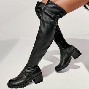 JUSTFAB OTK STRETCH LUG SOLE BOOT FAUX LEATHER BLOCK HEEL INNER ZIP TRUE TO SIZE