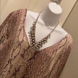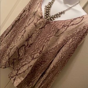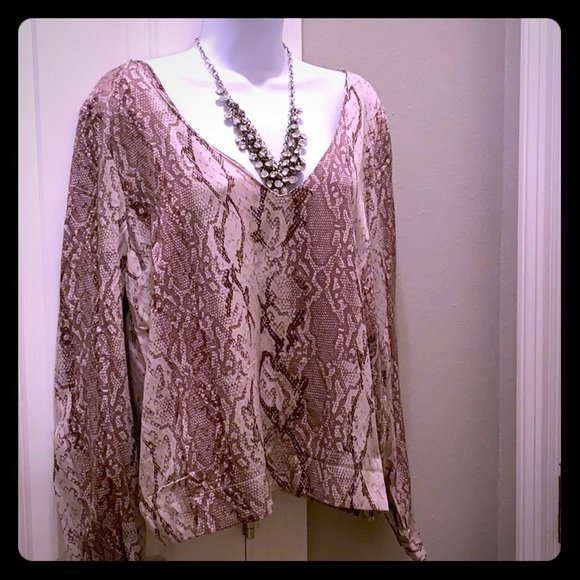 100% Tayon- Super flowing fabric that’s light when worn alone or could be layered with a camisole and jean jacket or flowing trench for a Fab approach to your day or night. Cut low in the front which makes for a beautiful necklace display! Colors are tan, brown and mocha. Also has buttoned sleeves.