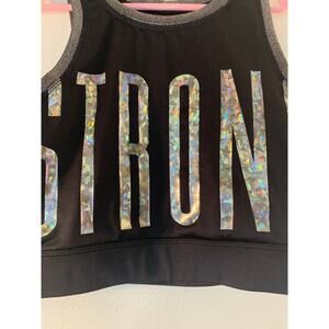 “STRONG” across chest in silver holographic type print. Cross cross strap details on back