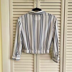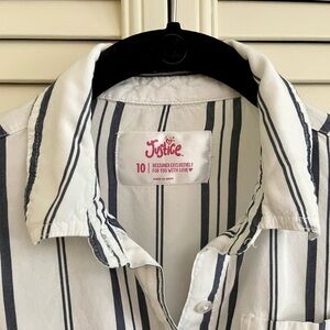 JUSTICE, GIRLS BLUE & WHITE STRIPE, COLLARED TOP. BUTTON DOWN FRONT WITH TIE AT BOTTOM. LONG SLEEVE. ELASTIC BOTTOM AT BACK WAIST. SIZE 10.