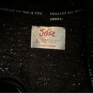 Elevate your little girl's wardrobe with this stylish black metallic fuzzy pullover sweater from Justice. The sweater features a mock neck, long sleeves, and a half zip closure, making it perfect for any casual or activewear occasion. The garment is designed to cater to size 12/14 girls and is made of premium quality material, making it machine washable for easy care.