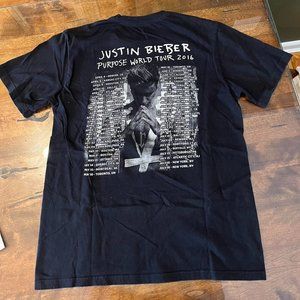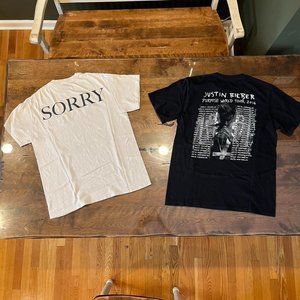 Real shirts from the Purpose Tour. They’re in great condition after all these years. The shirts are black and cream. Both made with 100% cotton. Both are a size Medium. This merch is great for any belieber.