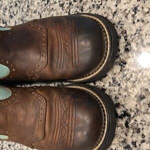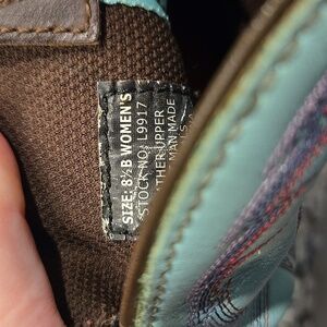 Pre-owned. Very good condition. Some minor scuffing. I have leather conditioned them. Beautiful teal color with brown. Soles look very good.