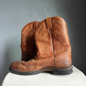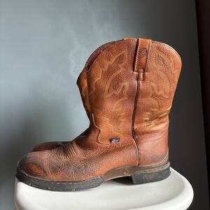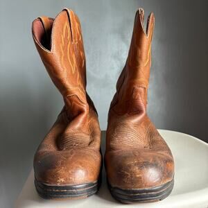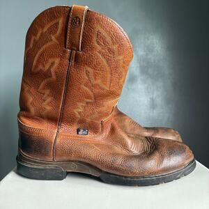 Howdy! Up for sale are these fantastic Justin Men's George Strait Twang Brown Cowboy Work Boots. These boots are a size 12EE and feature a classic round toe Western design. Crafted with quality materials and attention to detail, they offer both style and durability for any cowboy or work boot enthusiast. These boots have great traction, and will serve you well on any ranch, jobsite, or dance floor!