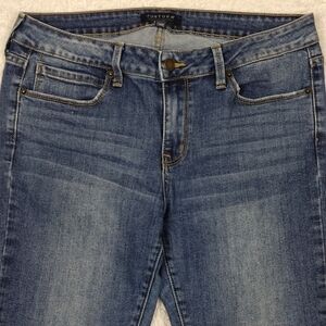 Just USA Women's Blue Whiskering Medium Wash Five Pocket Button Zipper Front Closure Mid Rise Light Distressed Raw Hem Straight Leg Ankle Denim Jeans. 73% Cotton, 14% Rayon, 11% Polyester, 2% Spandex. Light Front Back Pocket Distressing. Fading Throughout Thighs/Back Pockets. Measurements approx. Flat Lay. Waist: 16, Rise: 9, Hips: 16, Inseam: 25.5". Size 30 Color May Vary Due To Lighting.