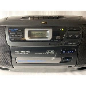 JVC Model RC-X540 AM FM Cassette CD Portable Stereo Boombox Radio. The JVC RC-X540 is a portable stereo boombox with an AM/FM radio, cassette deck, and CD player. The boombox is manufactured by JVC and has a model number of RC-X540. The boombox does not have information on its finish or manufacturing date. The boombox is available for purchase at a price of $79.99 for a used unit.