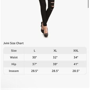 Elevate your wardrobe with these stylish and versatile JVINI leggings. Perfect for any occasion, these high-waisted, ripped skinny distressed pants in black are made from a comfortable and stretchy blend of polyester, spandex, and nylon. The fabric wash is dark, and the waist size is 32 inches, with an inseam of 28 inches and a rise of high (greater than 10.5 inches).