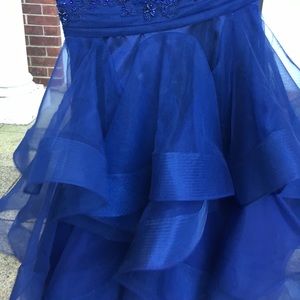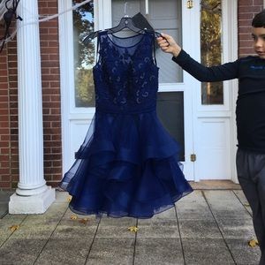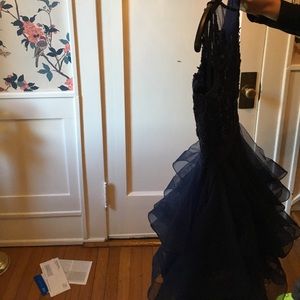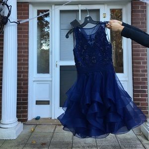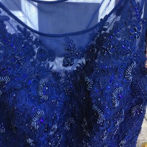 Worn once, size zero. Navy with embellished top and flare skirt. Illusion sweetheart top. Open to offers!