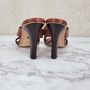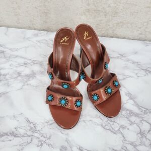 J Vincent Brown Heeled Sandals with Faux Turquoise Brass Studs Accents