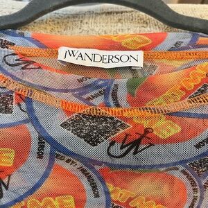 Mesh top with dynamic graphic design. Features a blend of blue, orange, and red hues.