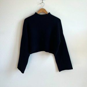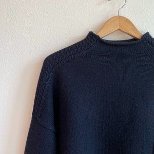 Elegant navy blue cowl sweater. Features a relaxed fit and long sleeves. Perfect for layering.