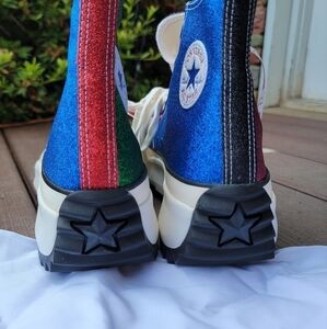 RARE platform JW Anderson x Converse size 13 women shoes NEW with out box but it brings dust bag multi colored platform Converse X Jw Anderson Glitter Run Star Hike Sneaker Multicolor Converse x JW Anderson Glitter Run Star Hike sneakers in a multicolored design. These sneakers feature a extra thick platform, a toothy rubber sole, and two lace options including white or another pair with JW Anderson branding. men Size 11.5 and women size 13 multi color rainbow ๐ŸŒˆ pride parade shoes NEW NO TAGS OR BOX BUT BRINGS DUST BAG