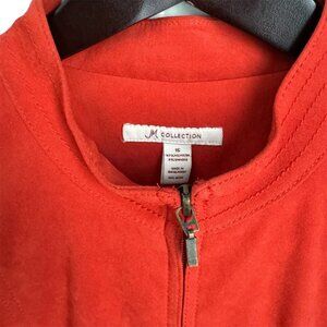 Step into effortless style with this Women's business casual rust-colored zip-up jacket in size 16. Designed with meticulous attention to detail with the stitching, this jacket features sleek side pockets for practicality and decorative buttons on the sleeves for a touch of sophistication. The warm rust hue makes it a versatile addition to your wardrobe, perfect for pairing with tailored pants or a skirt for an elevated yet comfortable look.