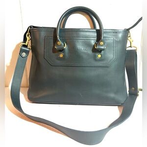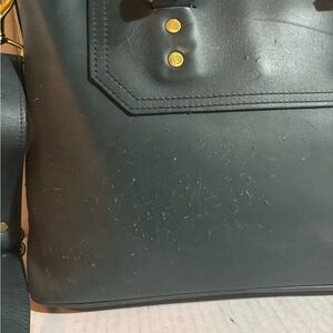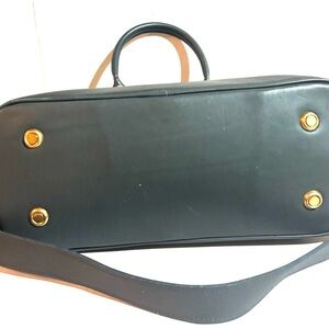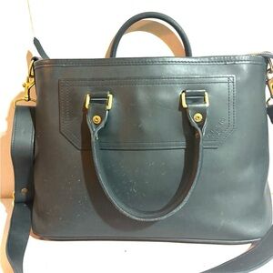 Discover the elegance of this black leather handbag, perfect for any occasion. Crafted with attention to detail, it offers both style and functionality. With gold tone hardware main compartment 3 pockets at interior wall 1 zip closure fabric lining exterior have scratches marks cracks front have www initials at front minor stains hight 10” wide 17” depth 6.5” strap drop 5” shoulder strap 26” adjustable The dimensions are based on approximately measurements before placing an order please check take a moment to view all photos using feature for a closer look