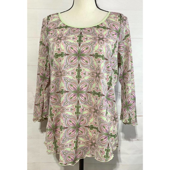 JW JAPANESE WEEKEND sz L green & pink flare sleeve maternity top